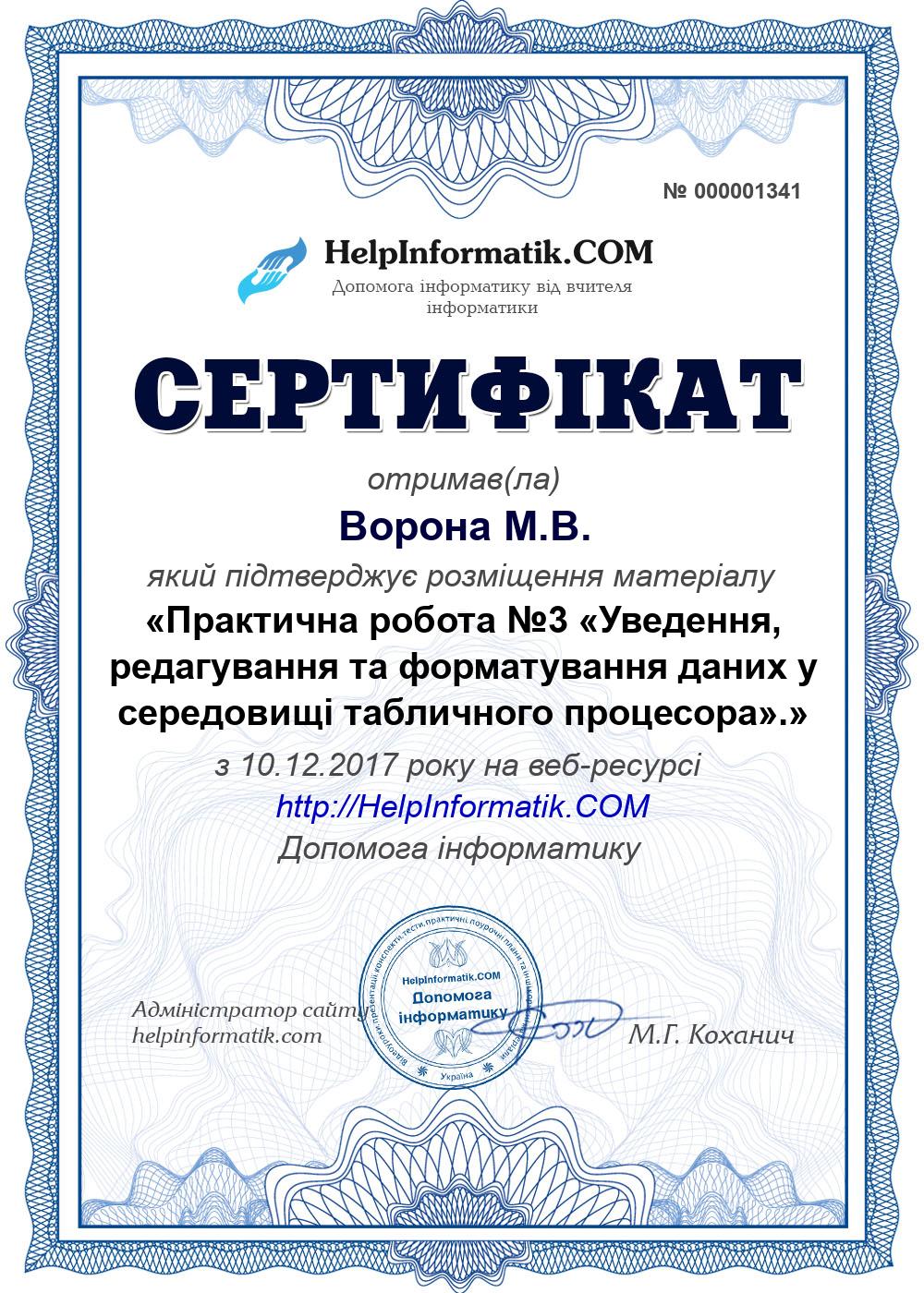 Практична робота №3 «Уведення, редагування та форматування даних у середовищі табличного процесора».