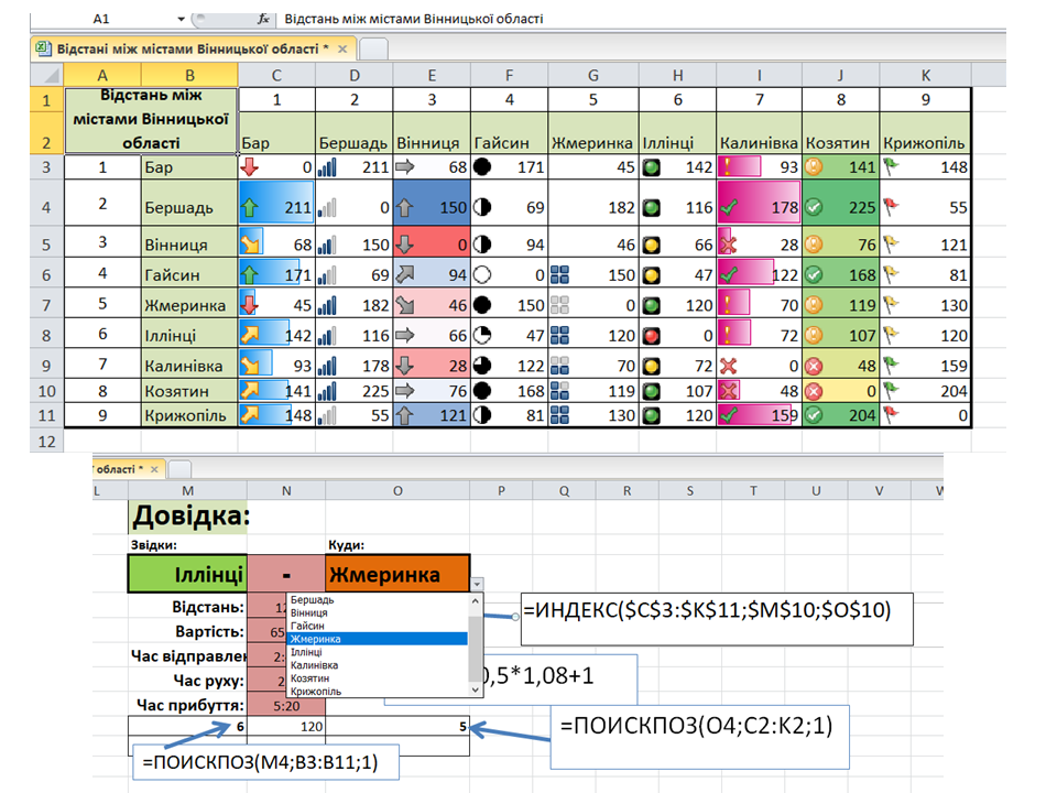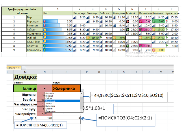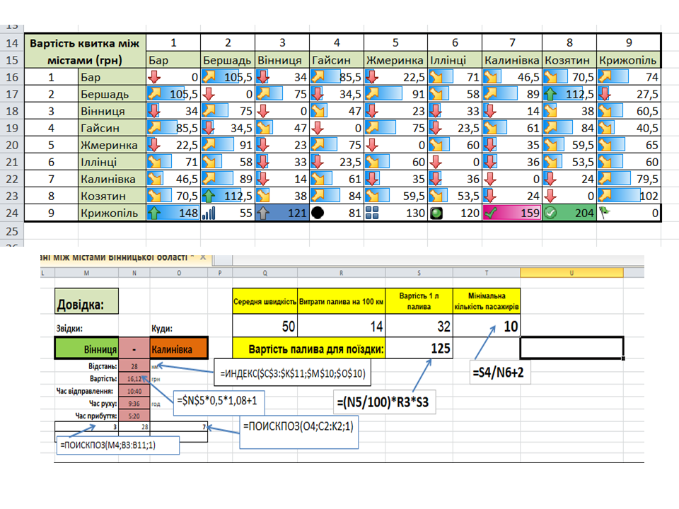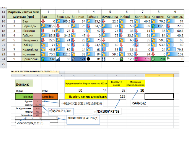 Завдання 1. Створити засобами табличного процесора Довідник «ТАКСІ» для користувачів послугами таксі між містами Вінницької області. Внести у таблиці відомі дані. Таблиця 1. Відстань між містами Вінницької області. Таблиця 2. Вартість квитка між містами. Таблиця 3. Графік руху таксі між містами. Таблиця 4. Графік прибуття таксі в пункт призначення.