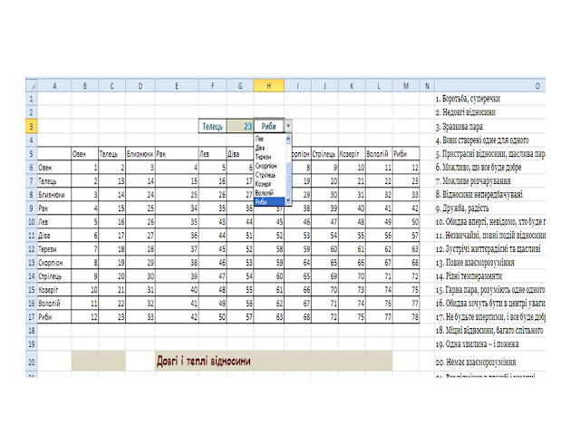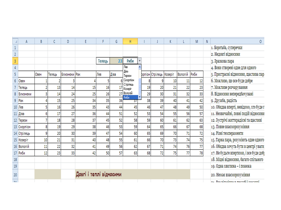 1. В комірках F3 i H3 створити розкриваючі списки з назвами всіх знаків зодіака.