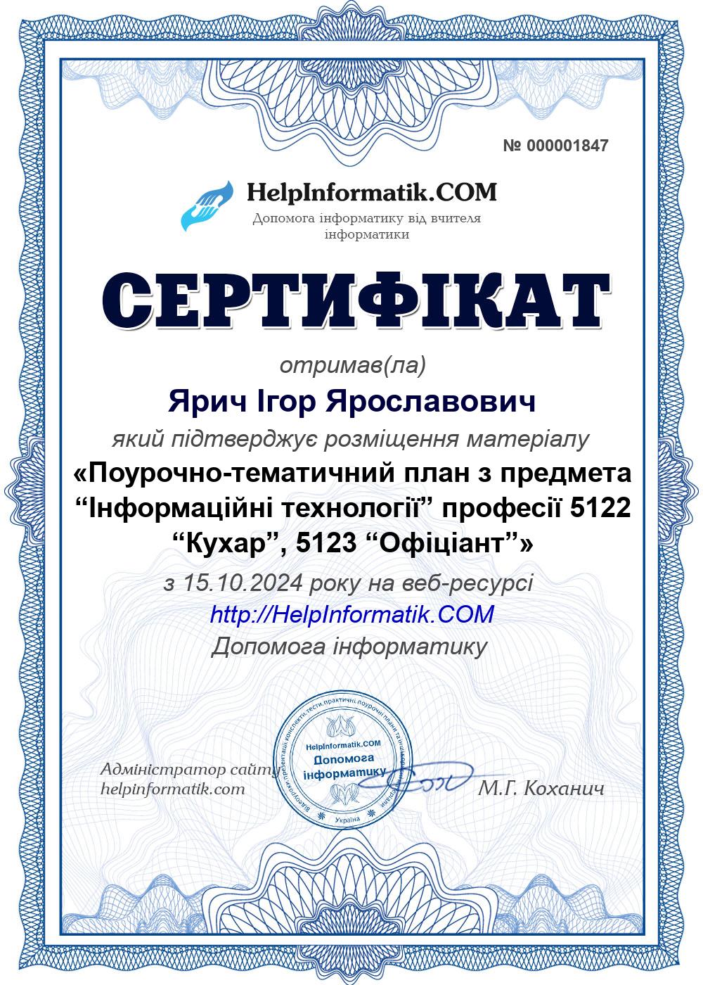 Поурочно-тематичний план з предмета “Інформаційні технології” професії 5122 “Кухар”, 5123 “Офіціант”