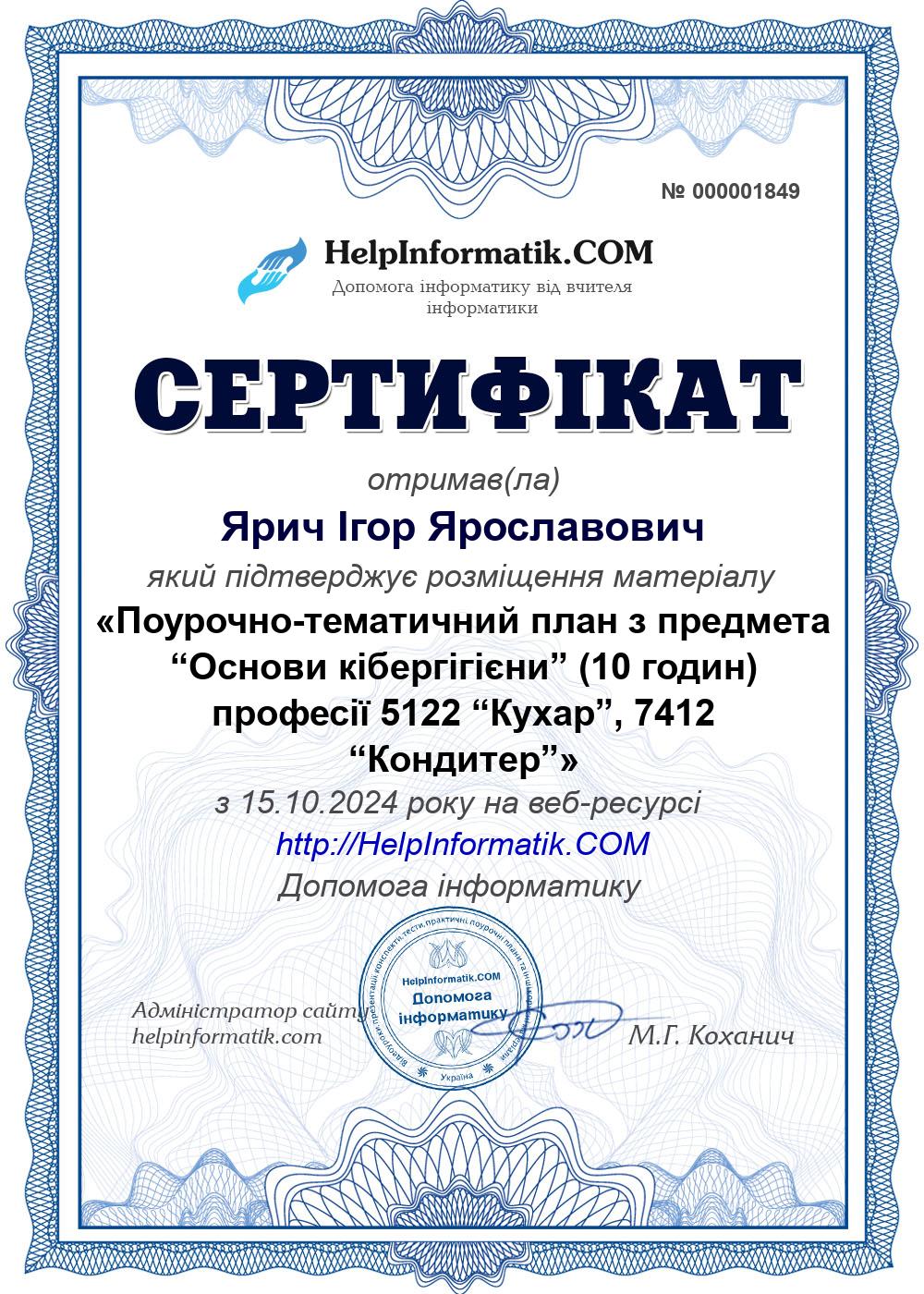Поурочно-тематичний план з предмета “Основи кібергігієни” (10 годин) професії 5122 “Кухар”, 7412 “Кондитер”