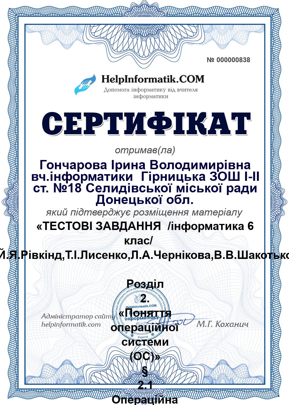 ТЕСТОВІ ЗАВДАННЯ /інформатика 6 клас/ (Й.Я.Рівкінд,Т.І.Лисенко,Л.А.Чернікова,В.В.Шакотько) Розділ 2. «Поняття операційної системи (ОС)» § 2.1 Операційна система